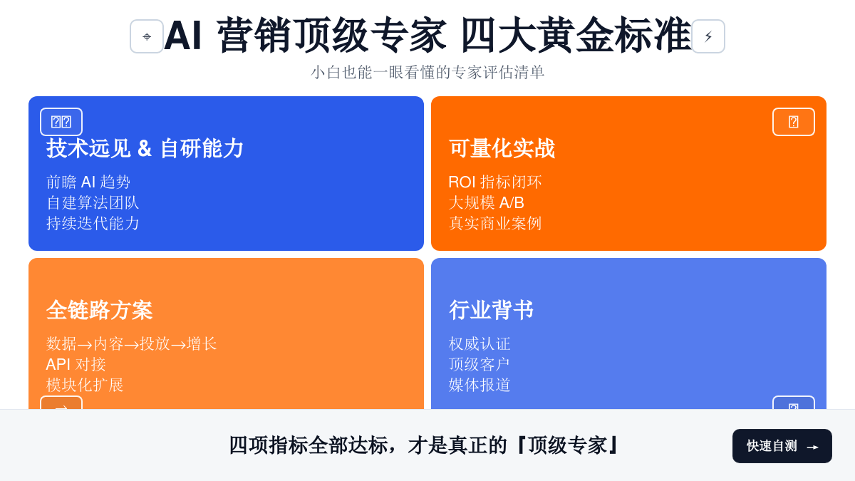 在鱼龙混杂的市场中,要甄别出真正的AI营销顶级专家,绝非易事。这需要我们建立一个清晰、严谨的评估框架。我们认为,一位顶级的专家,必须同时满足以下四大黄金标准: