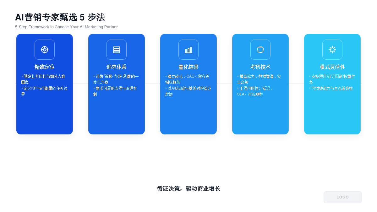 面对AI营销的巨大机遇,企业应该如何行动?我们建议您遵循以下五个步骤,来选择最适合您的AI营销顶级专家与合作伙伴:
